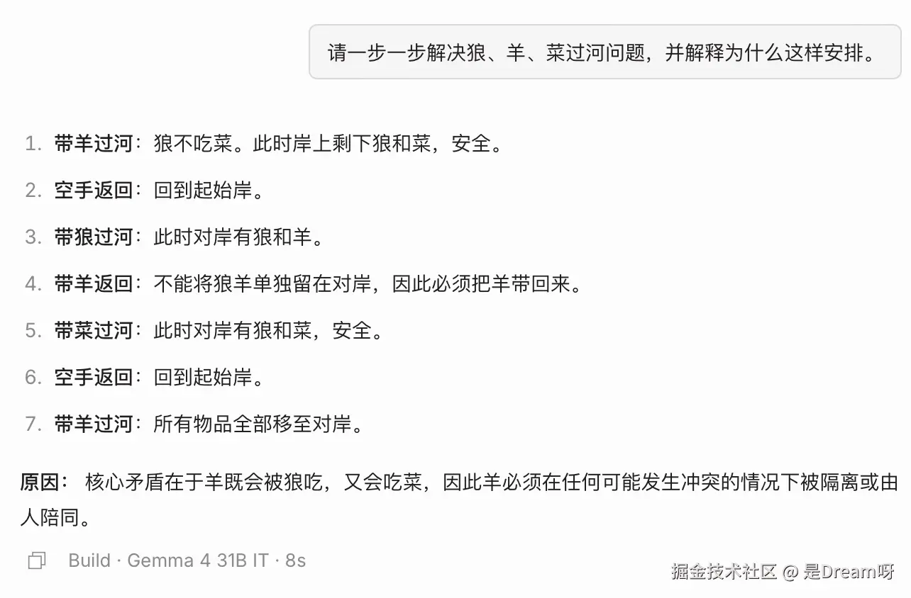 然后我又测试了一个更偏逻辑过程的问题,从实际结果来看,模型能够分步骤给出完整运输过程,并且补充说明羊既会被狼吃,又会吃菜,因此必须始终处于被隔离或陪同状态这一核心逻辑,这说明模型在这类结构化推理问题上也是可以的: