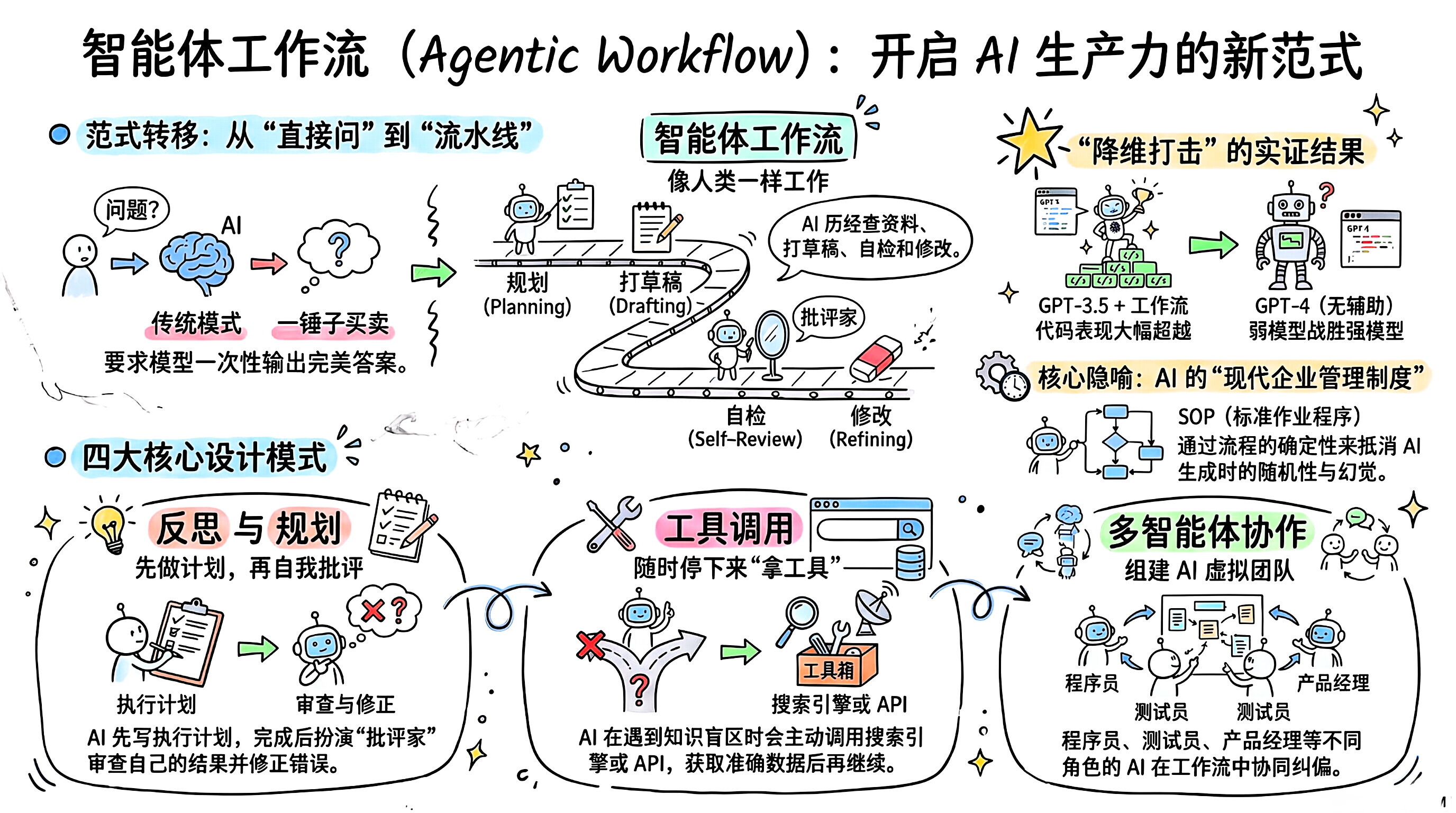 智能体 工作流 (Agentic Workflow ) 是由 AI 领域先驱吴恩达 (Andrew Ng) 大力倡导的一种全新 AI 使用范式。它代表了我们与大模型交互方式的根本性转变:从**"一锤子买卖"** 变成了**"流水线作业"** 。