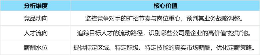 这种基于大数据的战略洞察,让招聘不再是盲目的。企业可以根据竞品的动作,提前布局人才池,或者在薪酬包设计上实现精准的差异化竞争。
