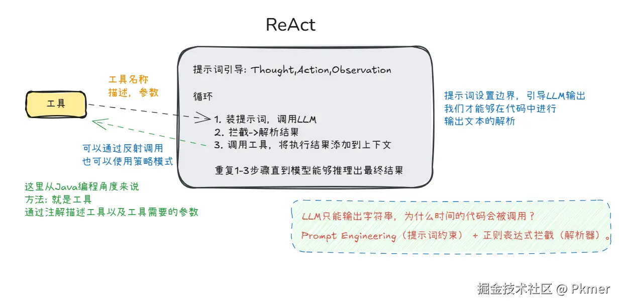 这是一种让 LLM 能够交替进行思考和行动的提示词框架。它不是让 LLM 一次性给出答案,而是让 LLM 像人类解决问题一样: