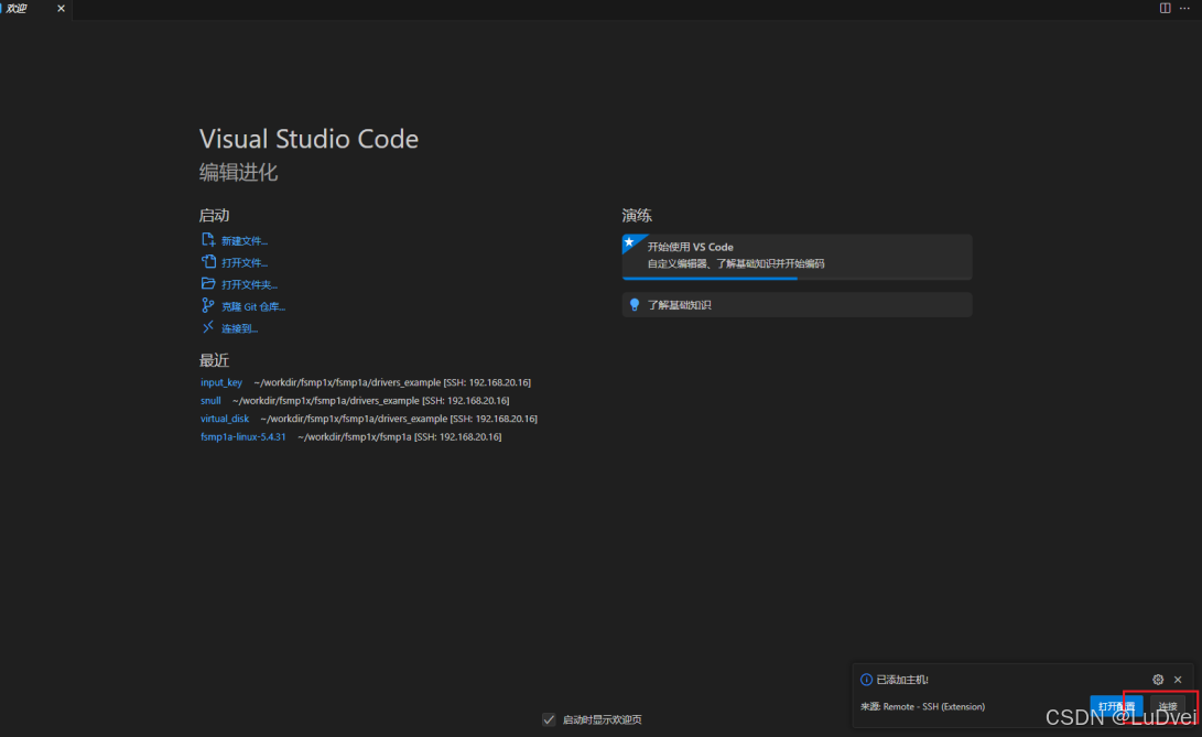 右下角会弹出连接主机提升,点击连接。或者重启 vscode 后在"远程资源管理器"窗口会出现新添加的主机 ip;