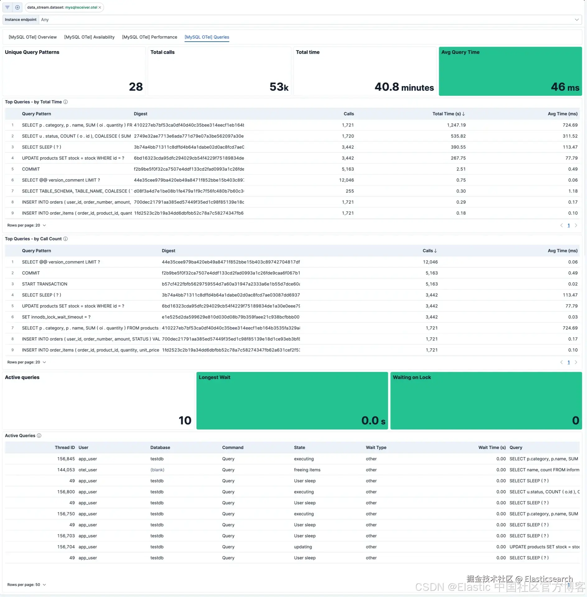下面是 Kibana 中 MySQL OpenTelemetry 仪表板的截图,展示了当数据开始流动时即可自动使用的开箱即用可视化内容。