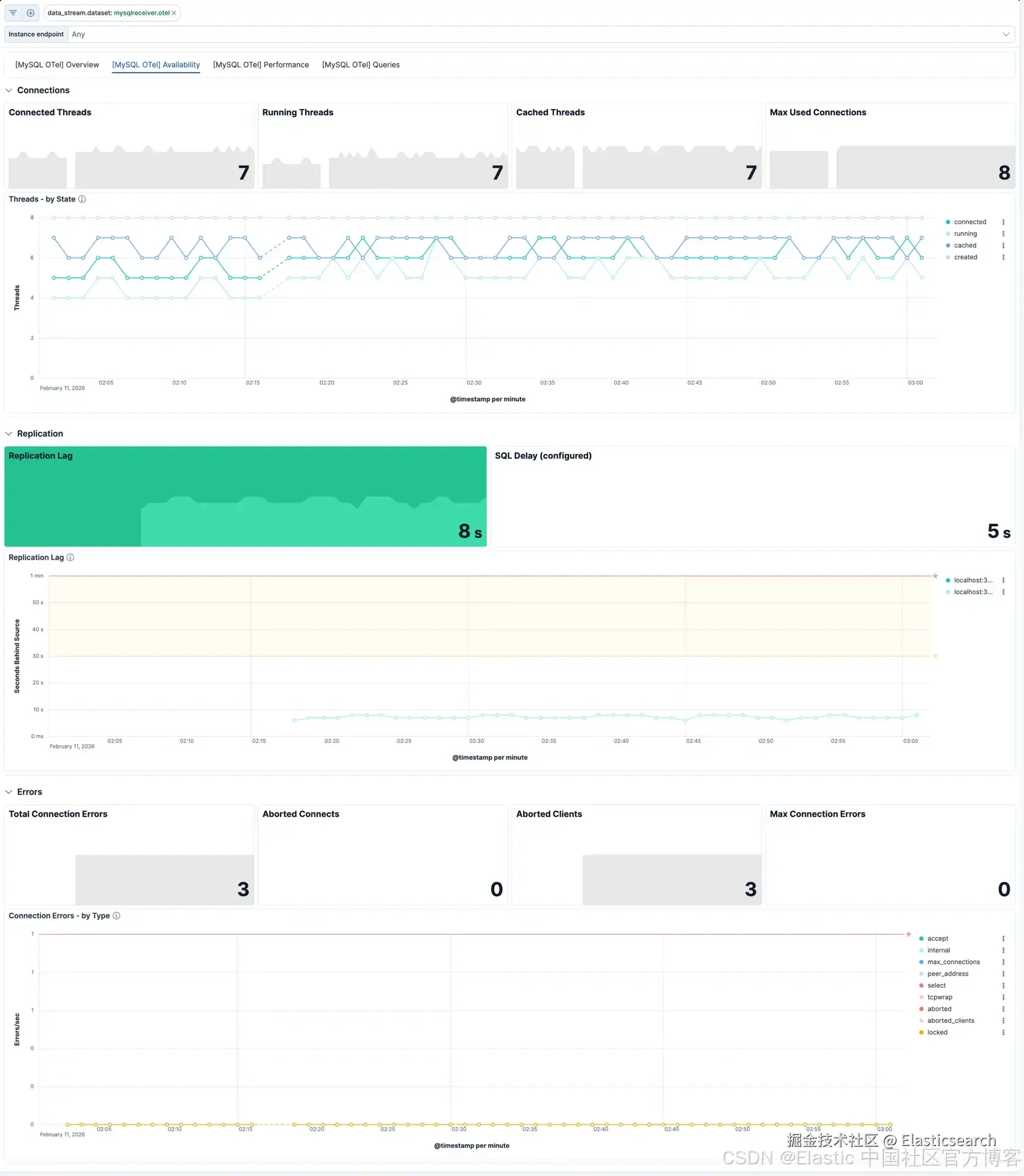 MySQL receiver 会按照配置的时间间隔从数据库中抓取指标和事件,并将其作为 OpenTelemetry metrics 输出。这些数据会流经 pipeline 并进入 Elasticsearch,随后即可用于可视化。