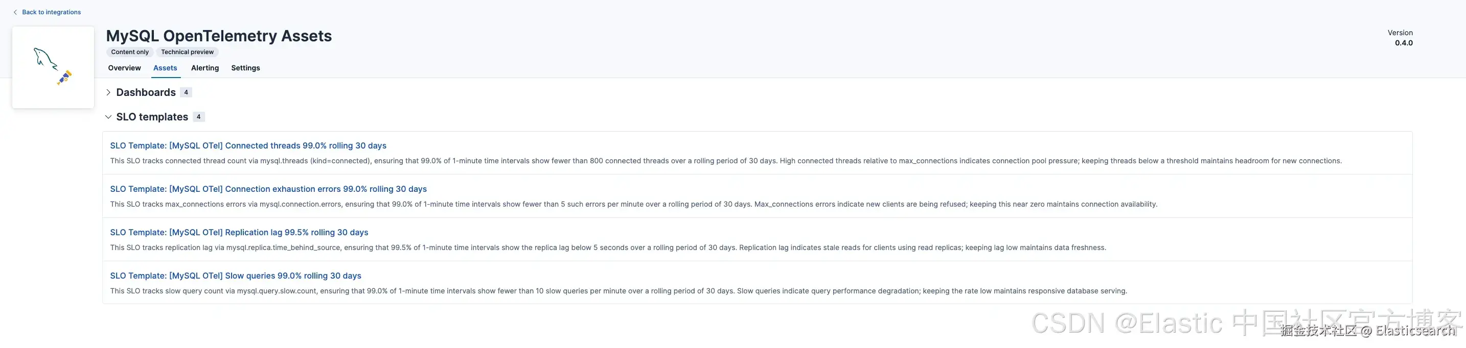 这个系统最强大的特性之一是自动安装。当 Elastic 检测到某个特定服务的数据开始进入 Elasticsearch 时,相应的内容包会自动安装 ------ 无需任何手动步骤,也无需在集成目录中查找。当你打开 Kibana 时,你的仪表板已经在那里等你,告警规则也已准备好启用,SLO 模板也已预先加载。