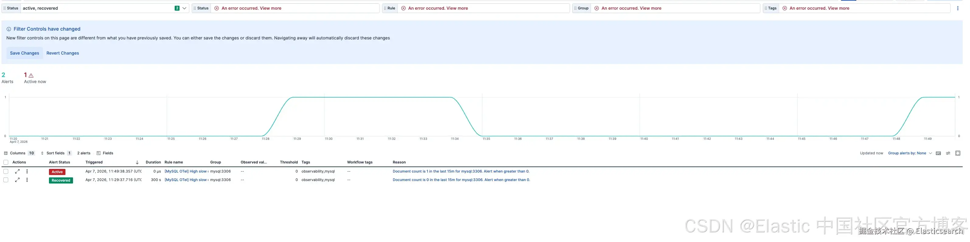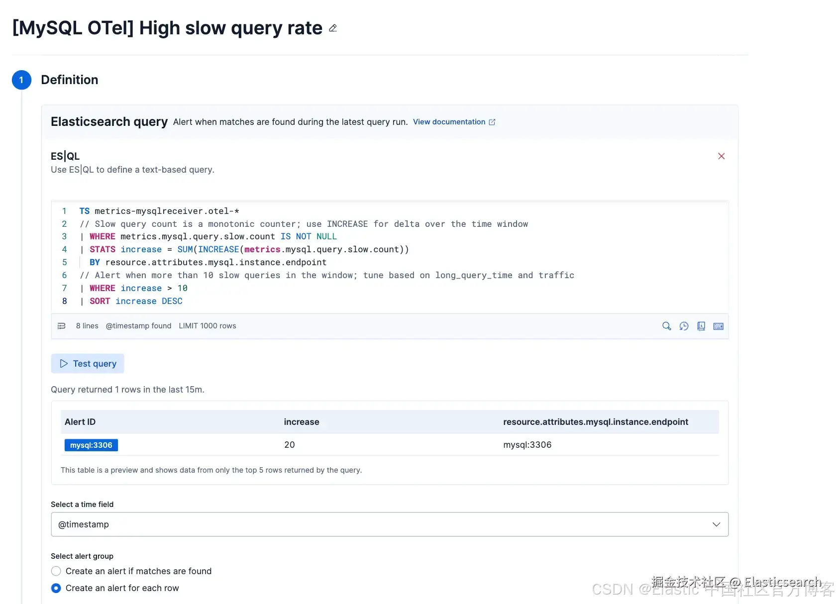 该内容包包含六条预构建告警规则 ------ 涵盖高连接错误率、慢查询激增、线程饱和、复制延迟、缓冲池脏页比例(buffer pool dirty page ratio)以及行锁竞争 ------ 每一条都带有推荐阈值和严重级别。这些规则在安装后即可使用,并且可以在 Kibana 中直接启用、调整和扩展,无需编写任何自定义查询。下面是其中一条告警的示例。