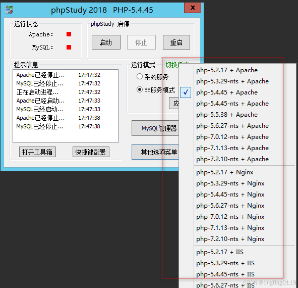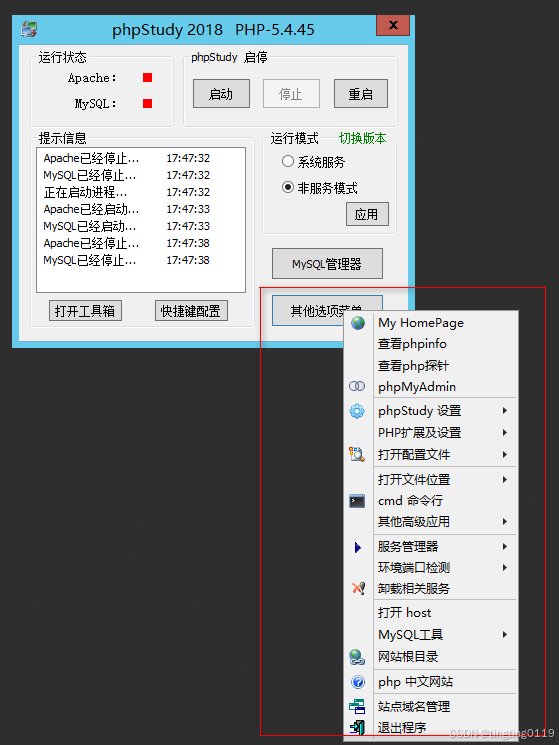 phpStudy是一个PHP调试环境的程序集成包。该程序包集成最新Apache+PHP+Mysql+phpMyAdmin+ZendOptimizer,一次性安装,无须配置即可使用,是非常方便、好用的PHP调试环境。该程序不仅包括PHP调试环境,还包括了开发工具、开发手册等等。