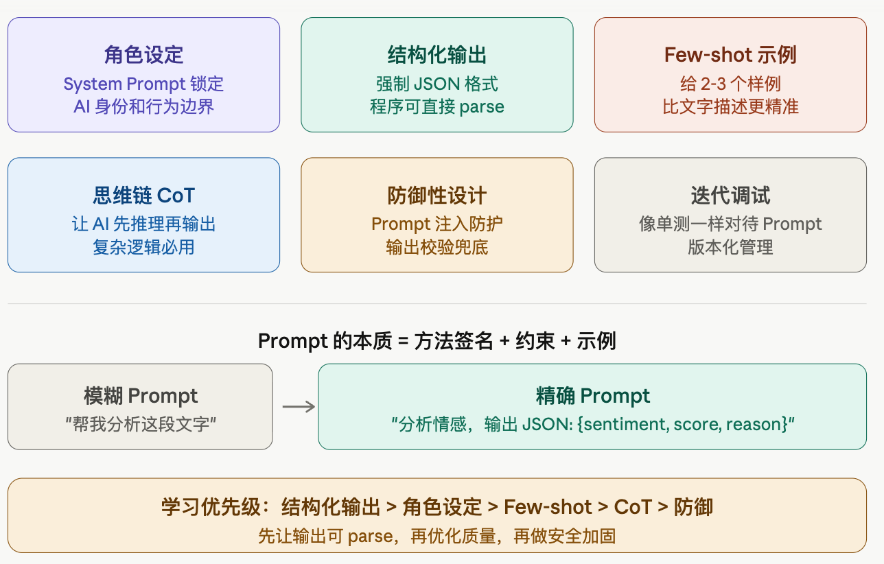 // 技巧1:角色设定 + 技巧2:结构化输出 + 技巧3:Few-shot