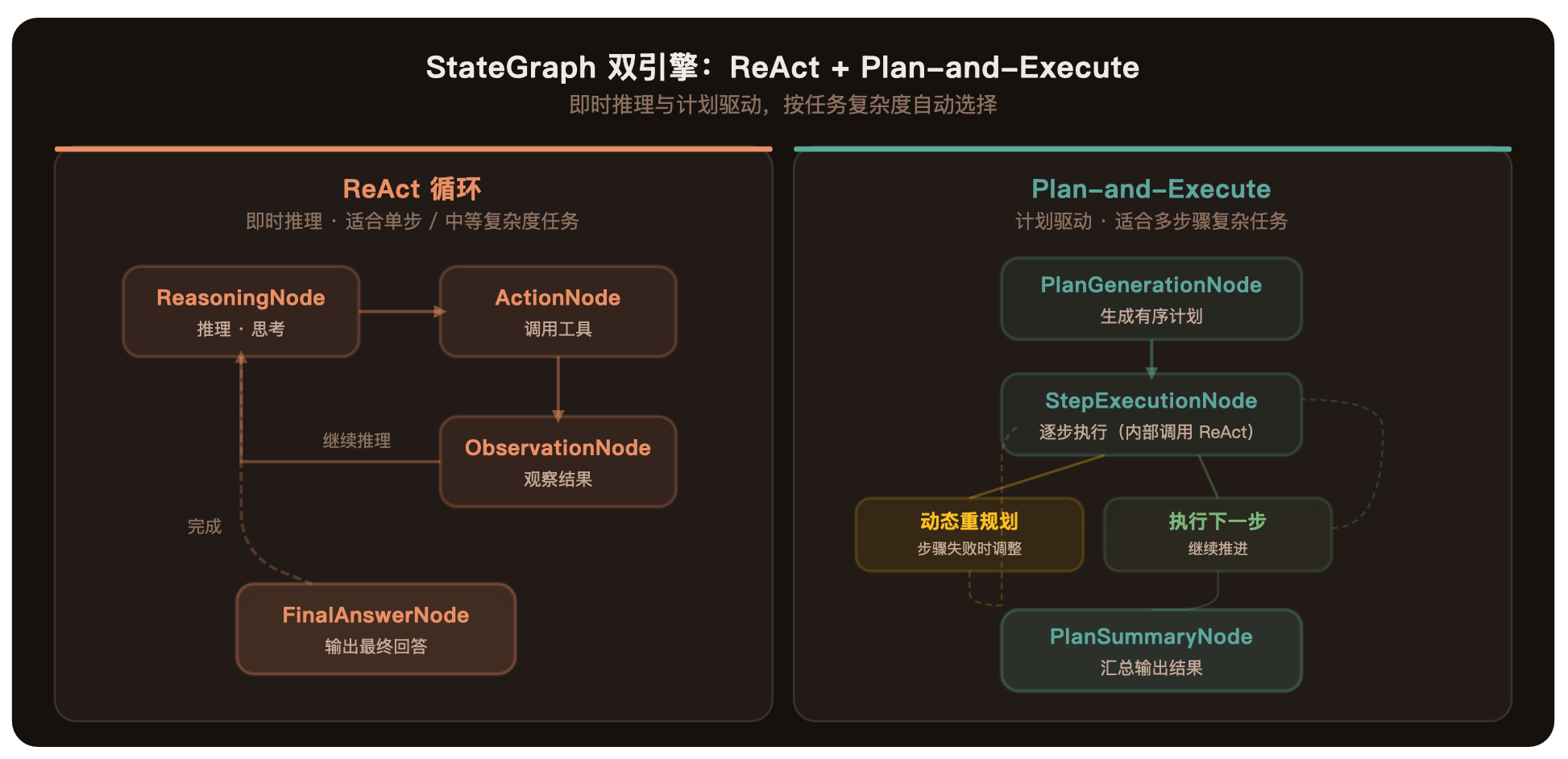 - Plan-and-Execute:先生成计划 → 逐步执行 → 动态重规划。适合复杂任务