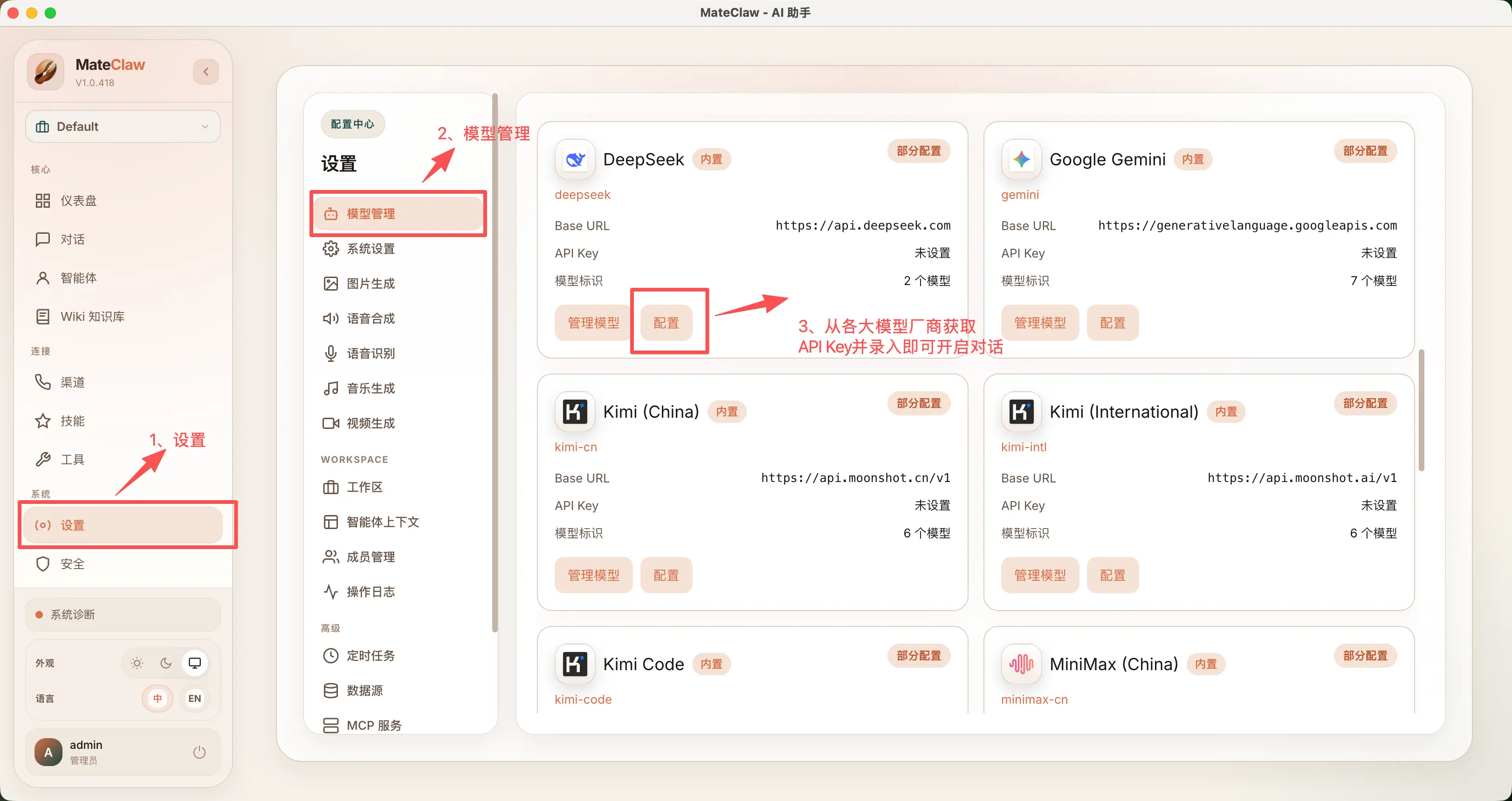 2. 设置 → 模型配置 → 选供应商 → 粘贴 API Key → 测试连接