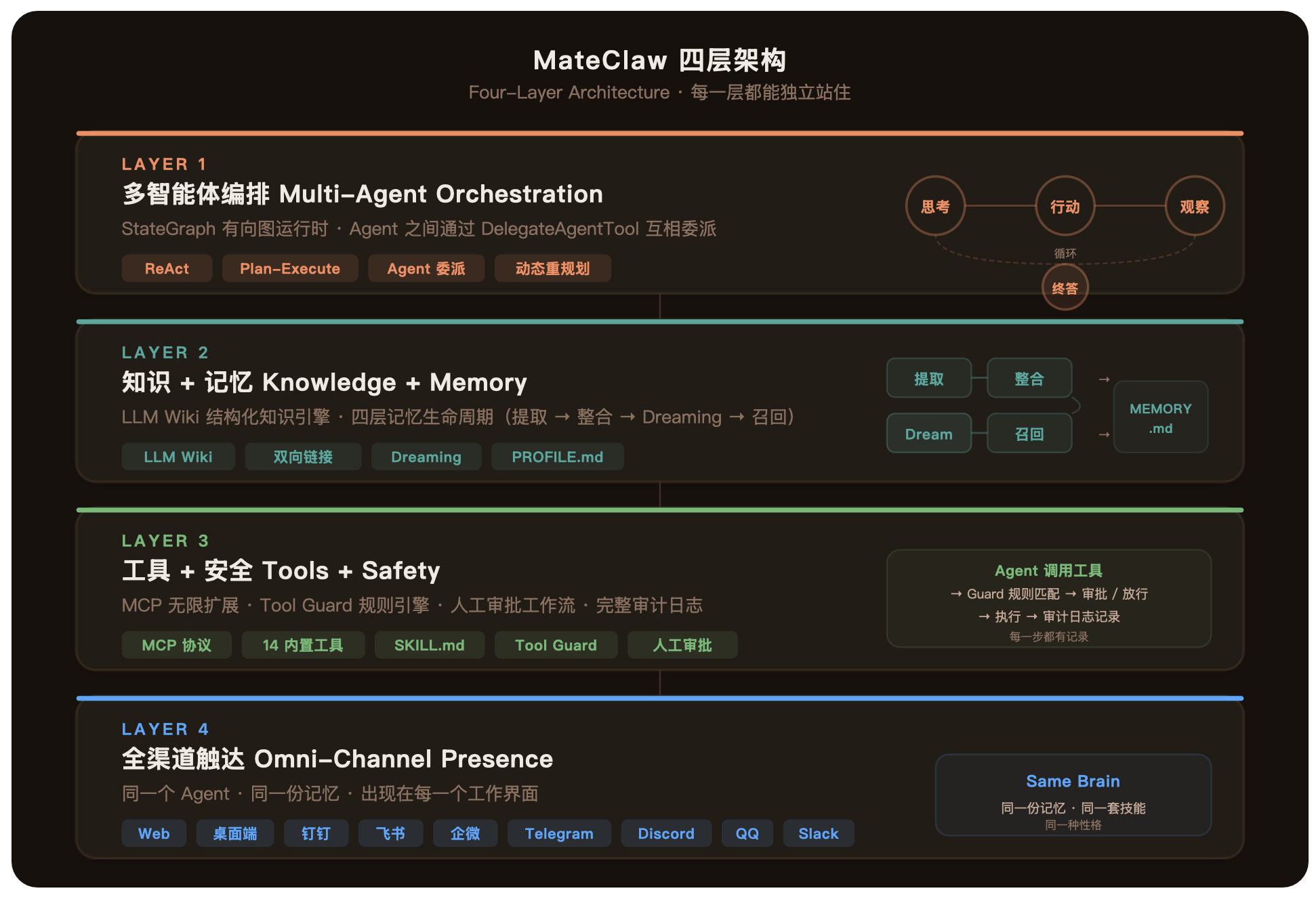 MateClaw 的架构分四层,每一层都能独立站住: