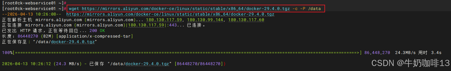 wget https://mirrors.aliyun.com/docker-ce/linux/static/stable/x86_64/docker-29.4.0.tgz -c -P /data