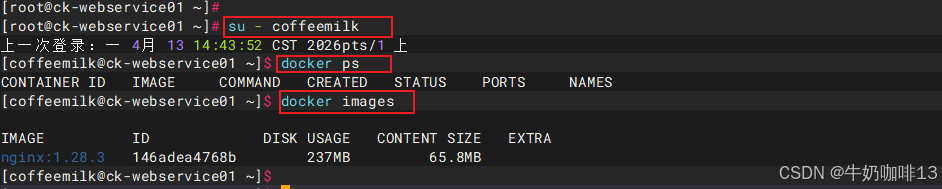 #3-退出当前终端或切换到普通用户执行docker命令测试(如:切换到普通用户coffeemilk)