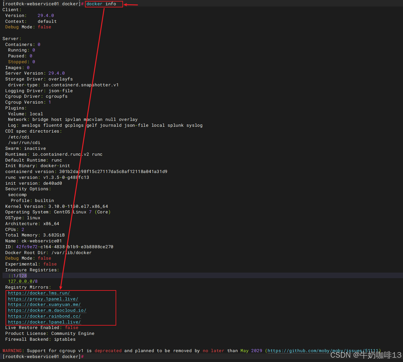 #7-查看docker的信息(若底部能够正常显示我们配置的【/etc/docker/daemon.json】文件的镜像加速地址则表示配置成功)