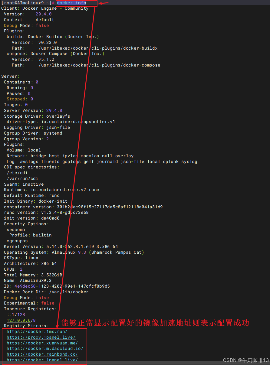 #查看docker的信息(若底部能够正常显示我们配置的【/etc/docker/daemon.json】文件的镜像加速地址则表示配置成功)