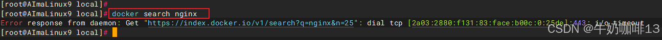 **注意:**即便配置了好了国内的docker镜像加速器,可以正常拉取到镜像;但还是无法查找docker镜像,会提示"Error response from daemon: Get "https://index.docker.io/v1/search?q=nginx\&n=25": dial tcp [2a03:2880:f131:83:face:b00c:0:25de]:443: i/o timeout"错误(这是因为配置的docker镜像加速器只针对下载,无法实现查找镜像)。