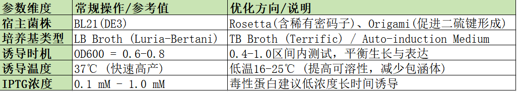 为了获得理想的蛋白产量,优化诱导条件是关键。以下是以BL21(DE3) 感受态细胞为宿主的标准操作参考: