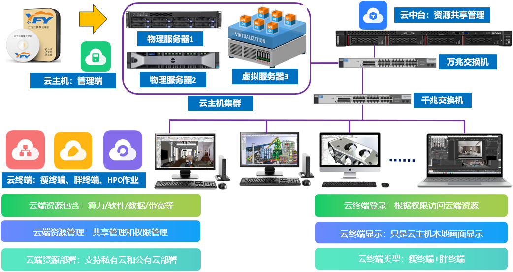 终端用户(如瘦客户机、旧电脑)仅负责输入输出,所有计算任务由云主机集群处理。
