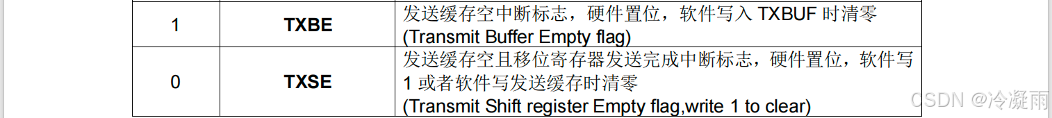 - 在发送过程中,软件向TXBUF写入,在TXBUF的数据转移到移位寄存器后,就会置位 发送缓冲区空 标志,使能中断的话就会进入中断服务函数。此时移位寄存器正在发出数据,如果此时软件认为已经发送完成而关闭了UART外设,就会导致数据无法发出,因此必须有 发送移位寄存器空 的标志,来表明数据确实已经发送完成。