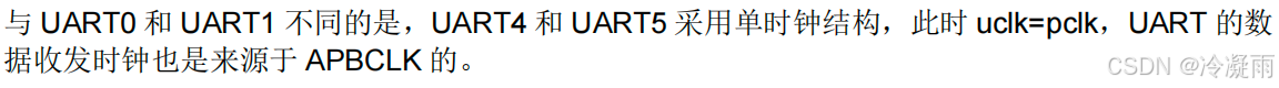 其中, F C L K {F_{CLK}} FCLK是UART外设的工作时钟,对于 UART4 和 UART5, F C L K {F_{CLK}} FCLK就是 APBCLK;对于 UART0 和 UART1, F C L K {F_{CLK}} FCLK可以是独立于 APBCLK 的工作时钟。