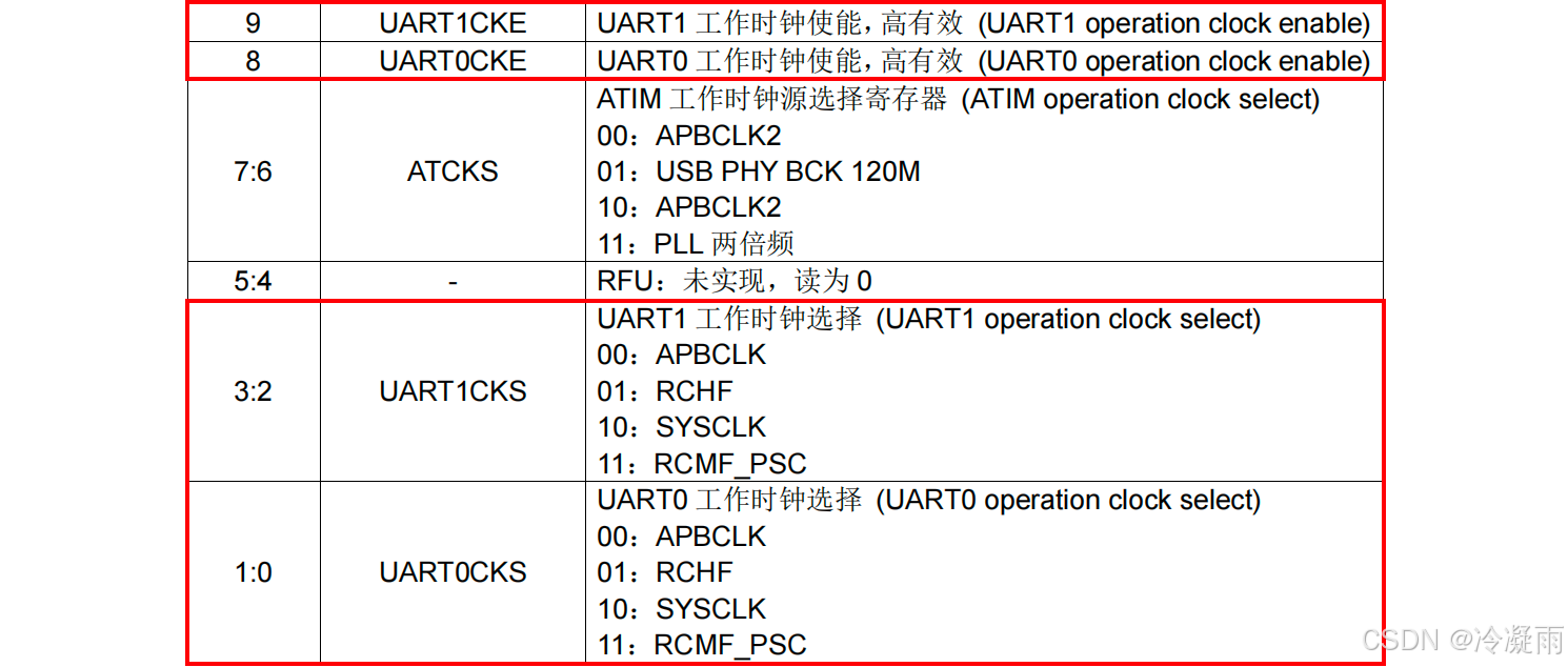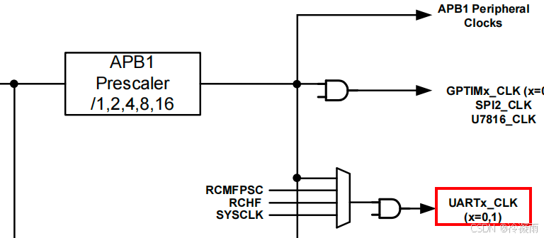 UART0、UART1的时钟源可以选择APB1总线时钟,RCMFPSC(分频后的中频RC振荡器)、RCHF(高频RC振荡器)和SYSCLK(系统时钟)。