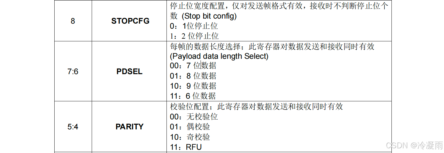 结束位、数据位和校验位的配置在UARTx->CSR控制状态寄存器中配置。
