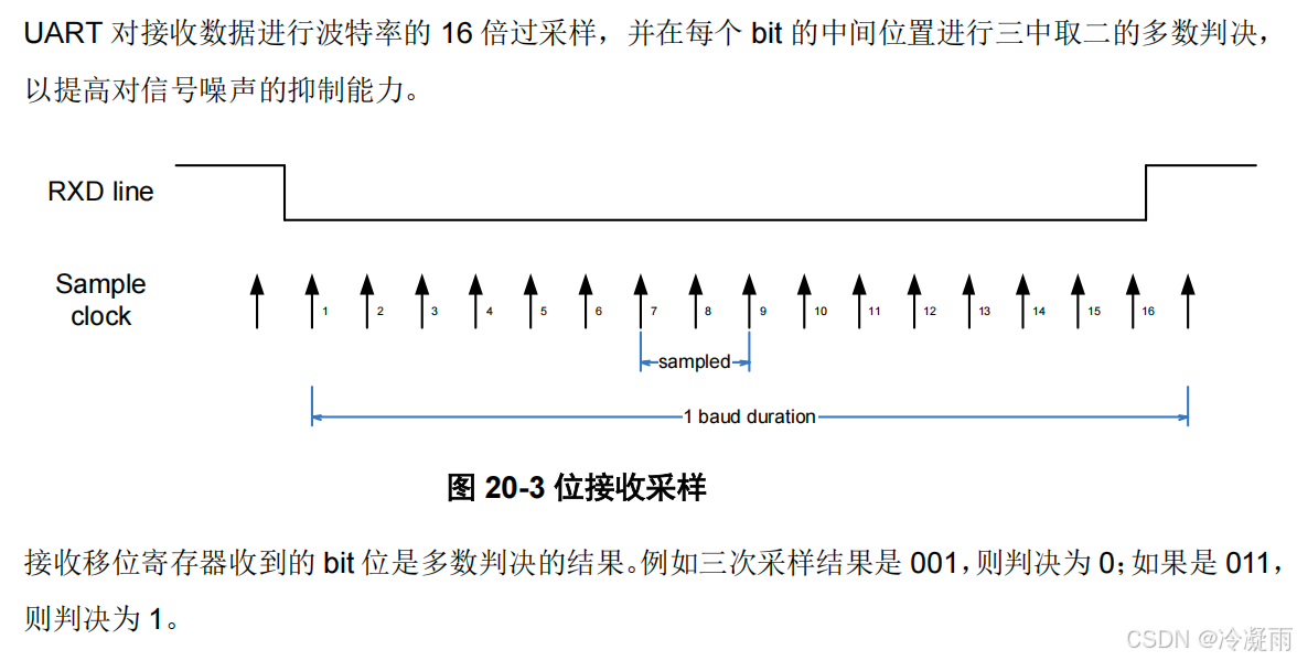 这是因为UART外设对输入信号进行了16倍过采样,以提高抗干扰能力。手册描述如下: