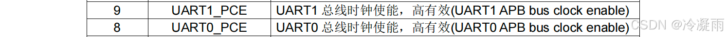 值得注意的是,UART0/1外设使用了双时钟结构。如果想修改其寄存器,则必须使能APB时钟。UART0/1外设在接收和发送过程中使用的时钟则可以选择其它的时钟来源,但由于寄存器修改的需要,应保证APBCLK时钟也是使能的。