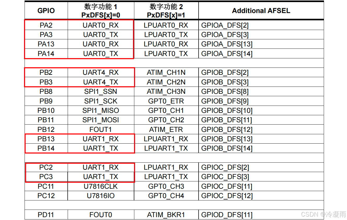 配置对应的GPIO->DFS寄存器,使串口引脚为对应的数字功能
