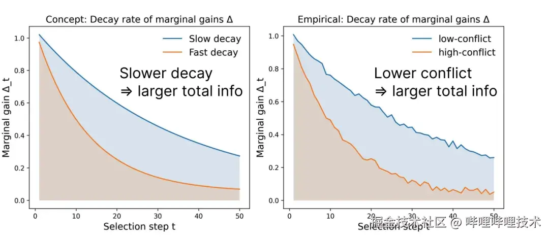 图1:边际信息增益 Δ 衰减越慢,同等预算下累计信息越大;实证上低冲突子集往往衰减更慢,信息更"耐用"。