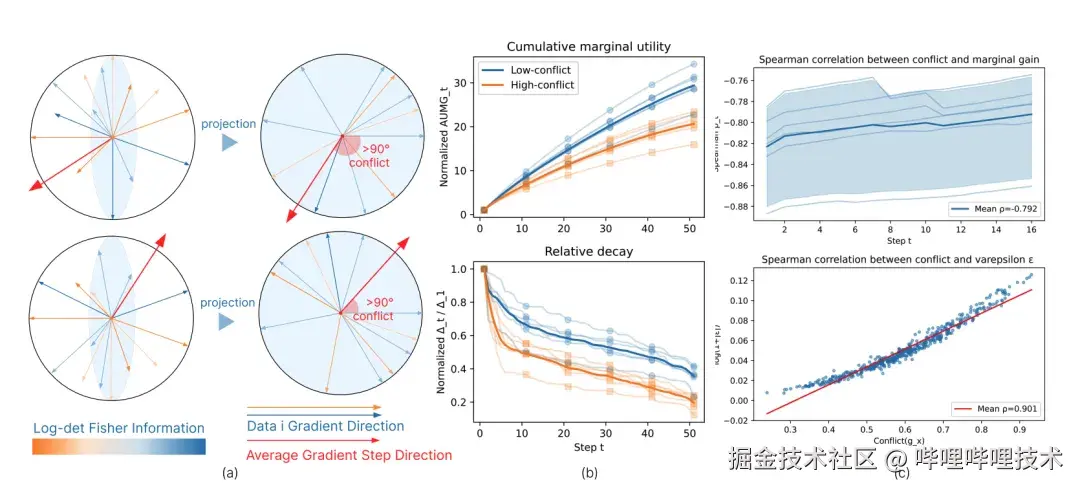 进一步分析后,我们发现,一个被忽略的重要因素是:样本之间的梯度冲突(gradient conflict) 。简单来说,不同样本在训练时会产生不同方向的梯度更新,如果这些更新方向彼此不一致,甚至互相对抗,那么即使每个样本单独来看都"信息量很高",它们组合在一起时,也可能互相抵消,从而加速信息增益的衰减。