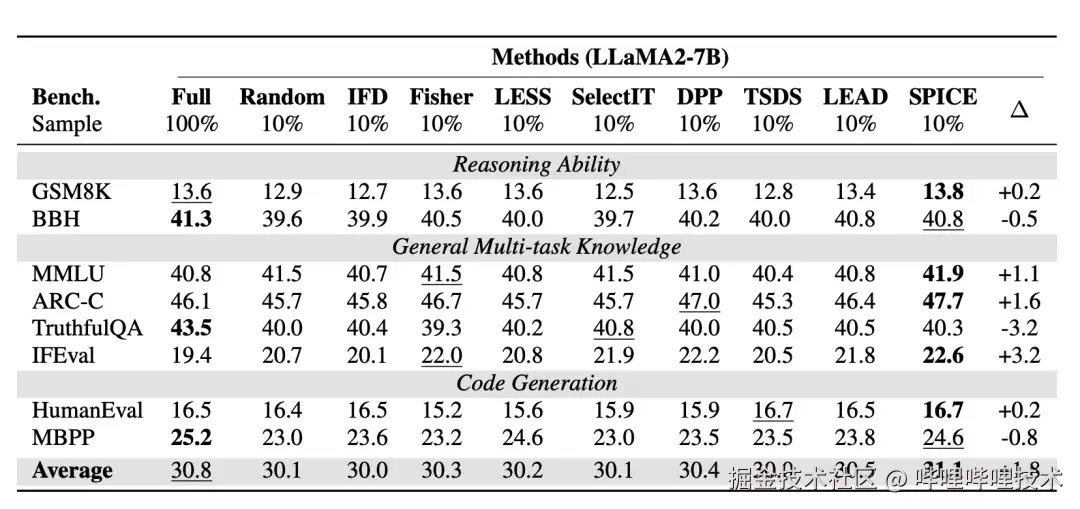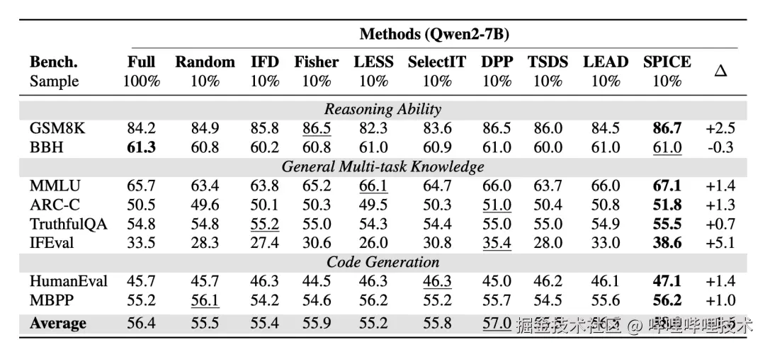 表1(Qwen2-7B/LLaMA2-7B):在仅用 10% 指令数据时,SPICE 在 GSM8K/MMLU/IFEval/HumanEval 等多类基准上整体优于多数选择基线,平均分也超过 Full/Random 等对照