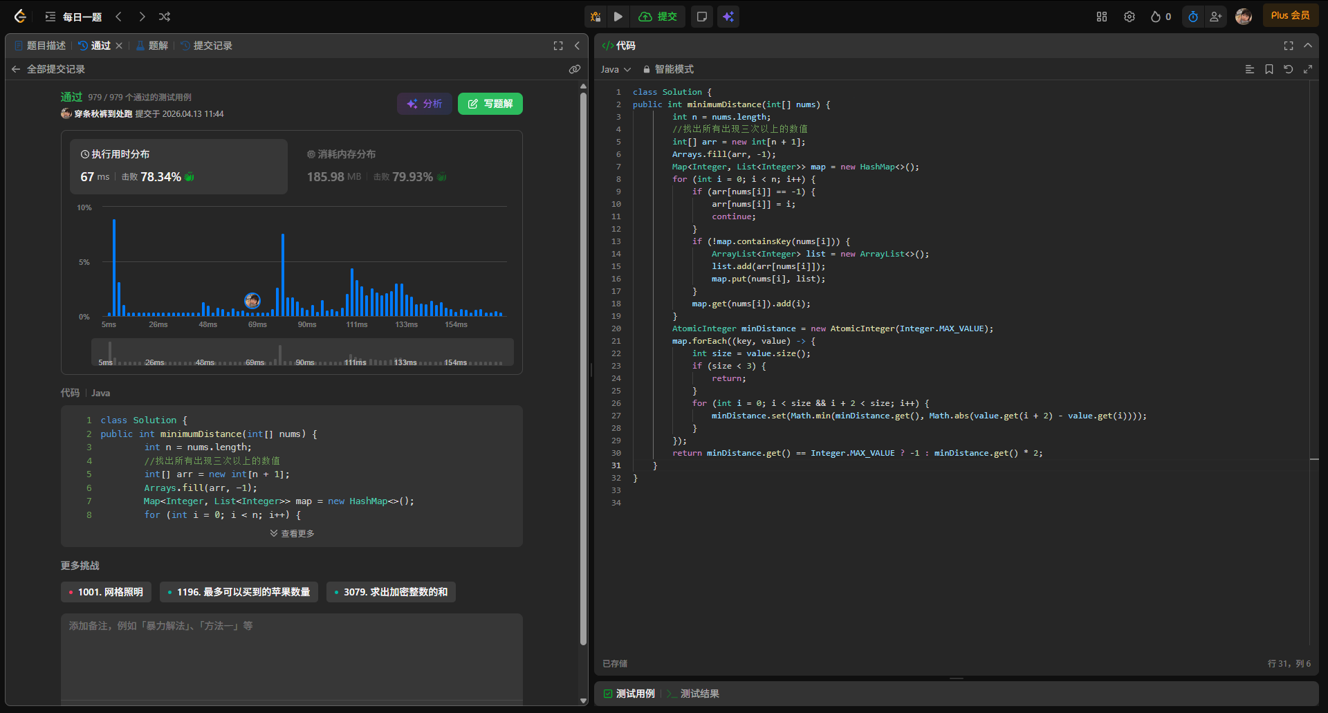 这道题和每日一道leetcode(2026.04.11):三个相等元素之间的最小距离 I的题目描述是一模一样的,只是n的取值范围从100扩大到了10e5,所以如果是简单的三层遍历,定然会超时。