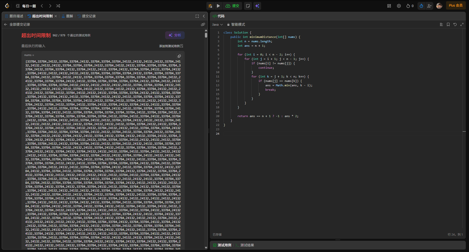 我这里的思路是先通过一层遍历,把我有出现过三次的数值的下标给收集起来,然后再挨个遍历这些出现次数大于等于三的下标,计算最短的距离。指的注意的是,三个不同下标的两两距离之和,只与两端的下标有关。设下标依次别为i,j,k,那么距离之和为(j-i)+(k-i)+(k-j)=2(k-i)。