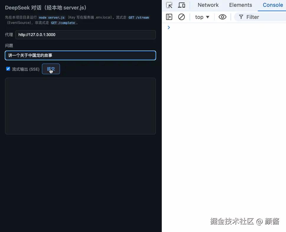 懒得本地建立代码,也可以直接clone代码,index-direct.html和index-stream.html能直接拖到浏览器,看效果。index.html拖入浏览器之前,需要首先node server.js,然后也能看到效果。哦,前提去申请一个deepseek的key。