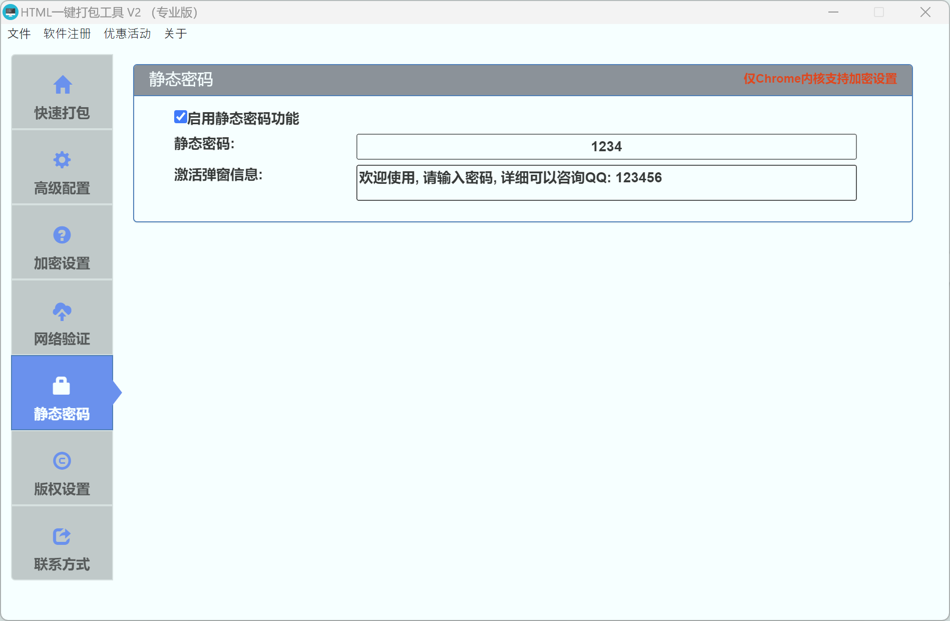HTML转EXE的静态密码功能允许你为打包的 EXE 文件设置一个固定密码,用户需要输入正确的密码才能使用软件。