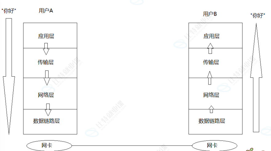 在网络传输的过程中,数据不是直接发送给对方主机,而是先要自定向下将数据交付给下层协议,最后由底层发送,然后由对方主机的底层来接受,自底向上交付: