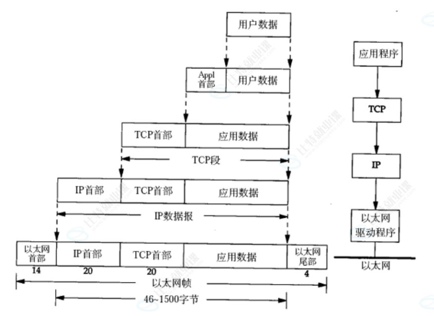 应用层数据通过协议栈发到网络上,每层协议都要加上一个数据首部(header),称为封装