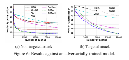 针对对抗训练模型的性能。 对抗攻击最流行的防御方法之一是 adversarial training [21]。为了评估所提出的攻击对 adversarial training 模型的性能,我们使用了来自 MardyLab 的 GitHub 仓库的预训练 ResNet50 模型。我们随机选择 200 个样本进行非目标攻击,并选择 200 对样本进行目标攻击。图 6a 显示我们提出的方法比 SOTA 基线表现好得多。一个可能的解释是 adversarial training 使边界更平坦 [24],而由法向量引导的 CGBA 充分利用了边界的平坦性。从图 6b 可以看出,所提出的方法在执行针对 adversarial training 模型的目标攻击方面也很有效。