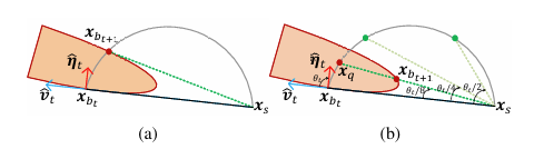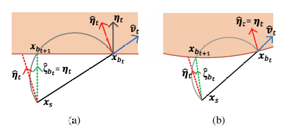 记 υ^t=(xbt−xs)/∥xbt−xs∥2\hat{\upsilon}{t} = (x{b_{t}} - x_{s}) / \| x_{b_{t}} - x_{s}\|{2}υ^t=(xbt−xs)/∥xbt−xs∥2 为从源点 xsx{s}xs 指向边界点 xbtx_{b_{t}}xbt 的方向,η^t\hat{\eta}{t}η^t 是在第 ttt 次迭代 xbtx{b_{t}}xbt 处的估计法线方向。该方法的核心思想是在 (η^t,υ^t)(\hat{\eta}{t},\hat{\upsilon}{t})(η^t,υ^t) 张成的二维平面内,在 η^t\hat{\eta}{t}η^t 所在的一侧进行边界搜索,以获得一个更好的后续边界点 xbt+1x{b_{t + 1}}xbt+1。该半圆形路径在 xsx_{s}xs 和 xbtx_{b_{t}}xbt 之间形成,圆心位于 (xbt+xs)/2(x_{b_{t}} + x_{s}) / 2(xbt+xs)/2,如图 1 所示。在 (η^t,υ^t)(\hat{\eta}{t},\hat{\upsilon}{t})(η^t,υ^t) 张成的平面内进行查询的搜索方向可以表示为: