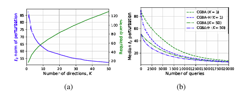 初始化的影响。 在上述实验中,为了公平比较,所有方法都使用相同的随机初始化。在本节中,我们将讨论如 4.3 节所述初始化对所提出方法在目标攻击中性能的影响。图 8a 展示了通过使用 KKK 个目标类样本,采用不同数量的随机方向来寻找 xb1\mathbf{x}{b{1}}xb1 所需的扰动量和相应的查询次数。从该图可以看出,随着 KKK 的增加,扰动量显著减少。虽然使用随机初始化(K=1K = 1K=1)时,通过大约 20 次查询获得的扰动量约为 85,但使用 K=50K = 50K=50 时,以大约 110 次额外的查询成本,扰动量减少了 30 以上。图 8b 比较了 CGBA 和 CGBA-H 在两种不同初始化(K=1K = 1K=1 和 K=50K = 50K=50)下的性能。由于通过 K=50K = 50K=50(适当计入额外查询成本)获得了更好的初始边界点,CGBA 和 CGBA-H 都比 K=1K = 1K=1 的初始化更快地收敛到最优扰动。值得注意的是,所提出的初始化方法也可用于提高基线的性能。