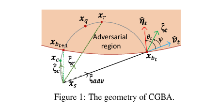 其中 ∥xbt−xs∥2(ζ^t⋅υ^t)=∥xbt−xs∥2cosψ\| x_{b_{t}} - x_{s}\|{2}(\hat{\zeta}{t}\cdot \hat{\upsilon}{t}) = \| x{b_{t}} - x_{s}\|{2}\cos \psi∥xbt−xs∥2(ζ^t⋅υ^t)=∥xbt−xs∥2cosψ 表示沿方向 ζ^t\hat{\zeta}{t}ζ^t 添加的 ℓ2\ell_{2}ℓ2-范数扰动,ψ\psiψ 是 ζ^t\hat{\zeta}{t}ζ^t 和 υ^t\hat{\upsilon}{t}υ^t 之间的角度差。通过改变 ζ^t\hat{\zeta}{t}ζ^t,我们查询目标模型 xq=xs+d(ζ^t)x{q} = x_{s} + d(\hat{\zeta}_{t})xq=xs+d(ζ^t),以在半圆形路径上进行边界搜索。