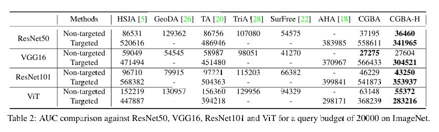 我们使用三个指标------扰动的中位数 ℓ2\ell_2ℓ2-范数、攻击成功率(ASR)和曲线下面积(AUC)------来评估 CGBA 和 CGBA-H 与 SOTA 黑盒攻击的性能。对于给定的查询预算,攻击产生的扰动中位数 ℓ2\ell_2ℓ2-范数决定了攻击的有效性。能够在一组测试图像上更好地减小扰动 ℓ2\ell_2ℓ2-范数的攻击被认为是更有效的攻击。此外,另一个流行指标 ASR 用于确定在给定查询预算和扰动阈值下对抗攻击的成功率。如果特定查询预算下获得的扰动低于扰动阈值,则认为攻击成功。此外,AUC------中位数扰动 ℓ2\ell_2ℓ2-范数与查询次数的曲线下面积------展示了攻击随查询次数收敛到最小扰动的速度。攻击的 AUC 值越低,攻击收敛到最小扰动的速度越快。