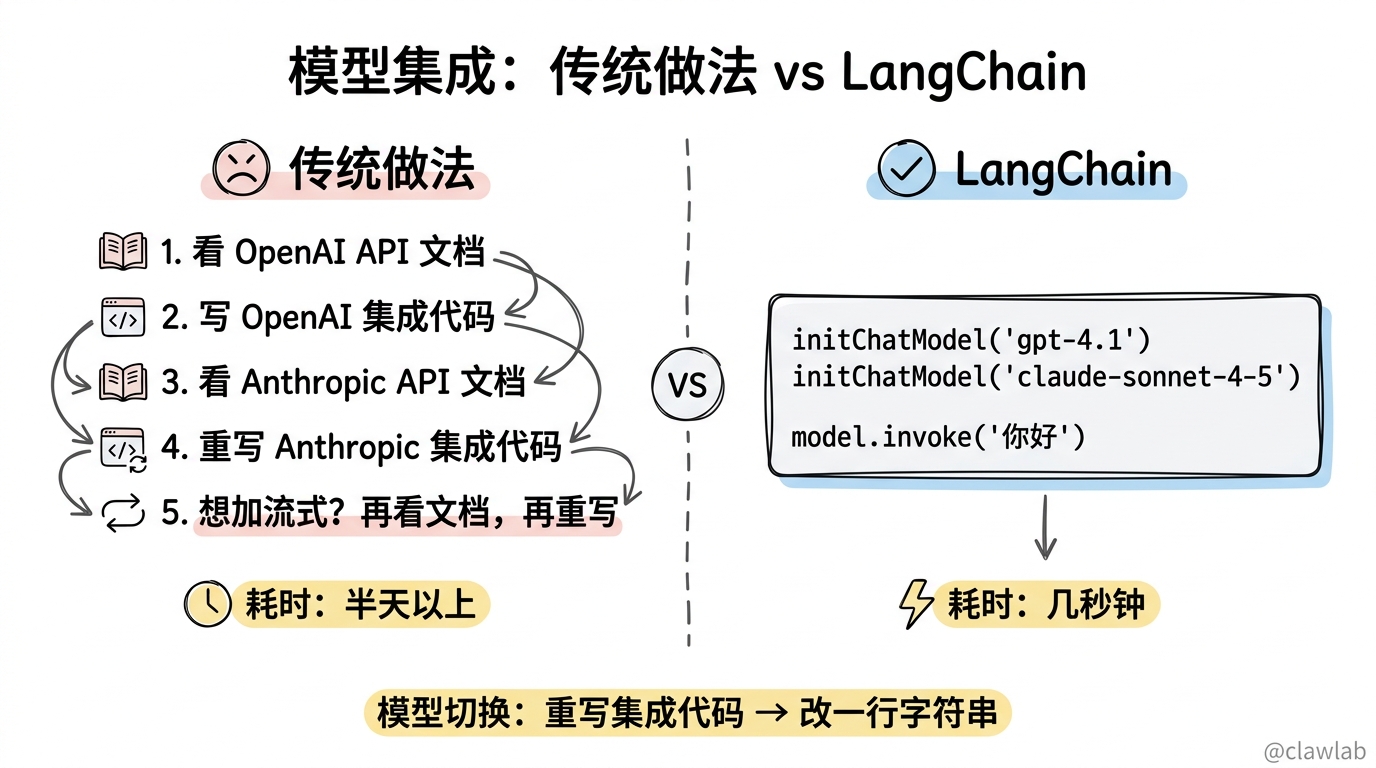 | 模型切换困难 | 每个模型有不同的 API,重写集成代码 | 想换模型?半天时间没了 |