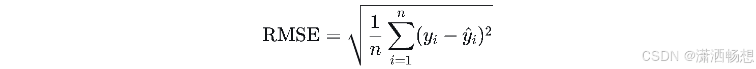| RMSE | \text{RMSE} = \sqrt{ \frac{1}{n} \sum_{i=1}^{n} (y_i - \hat{y}_i)^2 } \text{RMSE} = \sqrt{ \frac{1}{n} \sum_{i=1}^{n} (y_i - \hat{y}_i)^2 } |