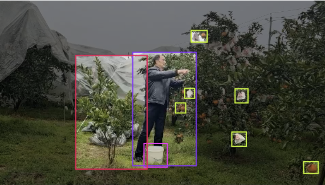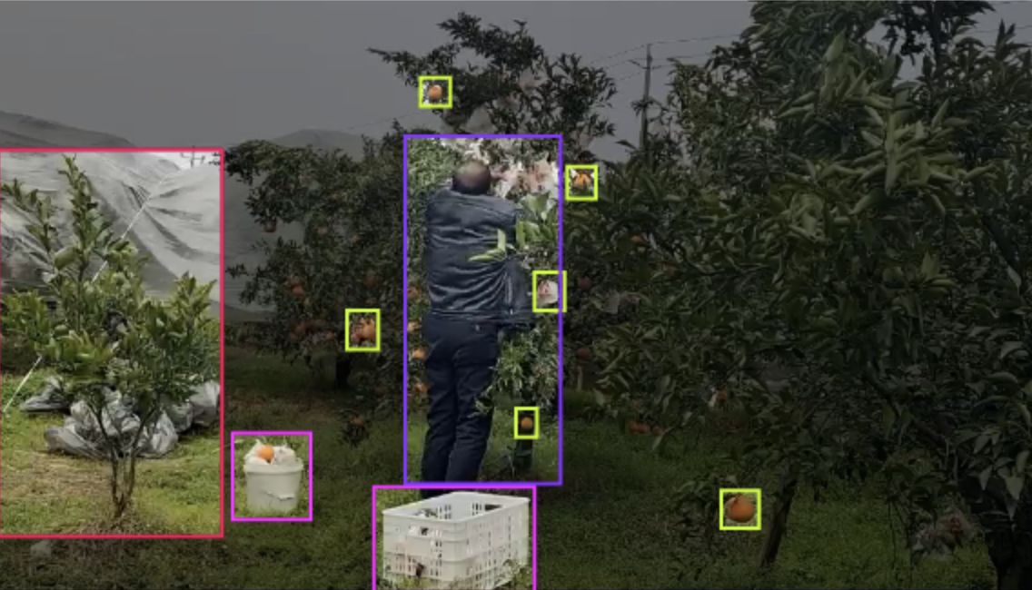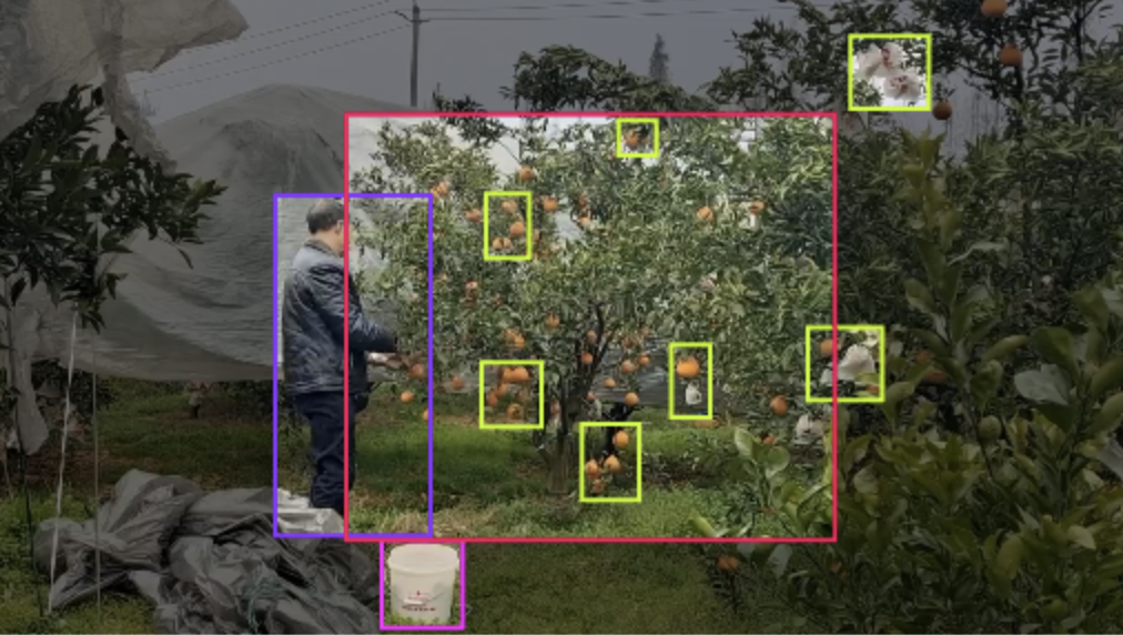 该数据集共包含 5 类目标,中文名称分别为:桶、橙子、人、剪刀、树