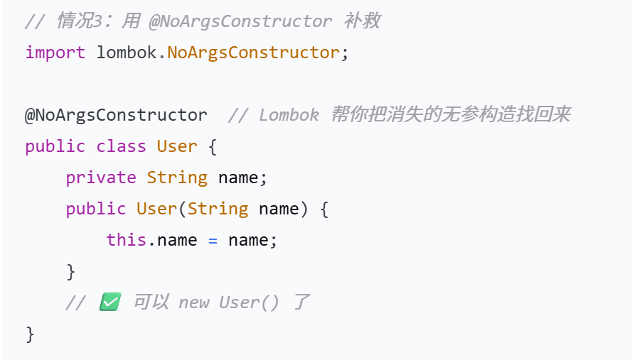 我们知道,当我们只写了一个有参的构造方法时,那个无参的构造方法就会直接不生成,这时候注解@NoArgsConstructor就其作用了,他会生成一个无参构造方法