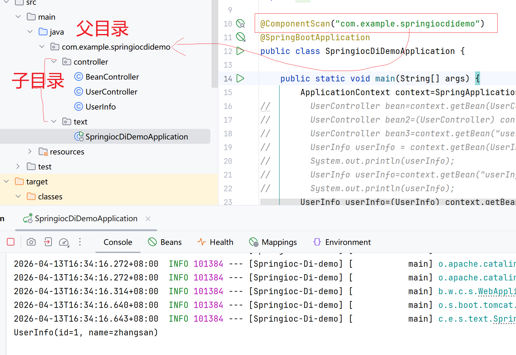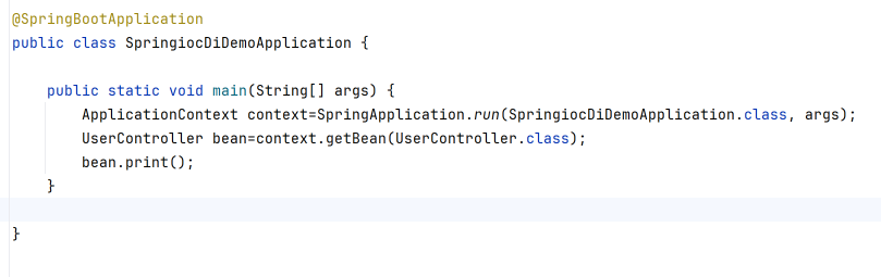 上面这个ApplicationContext context可以接收SpringApplication.run(SpringiocDiDemoApplication.class, args);的返回值,返回的context就是可以让我们去获取Bean。