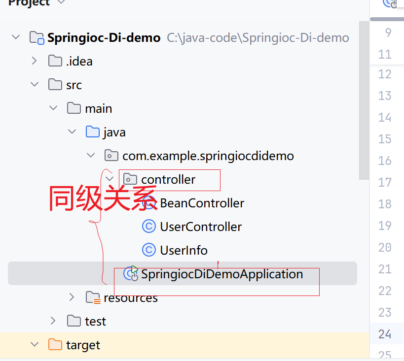 我们看到启动类和我们写的代码不在同一级目录下,我们试着运行一下,看看会发生啥