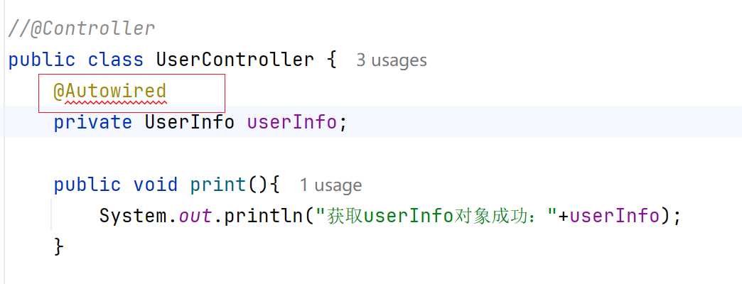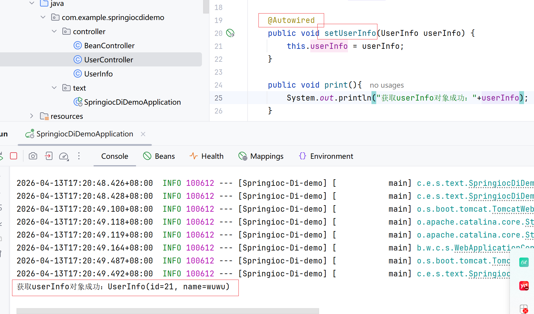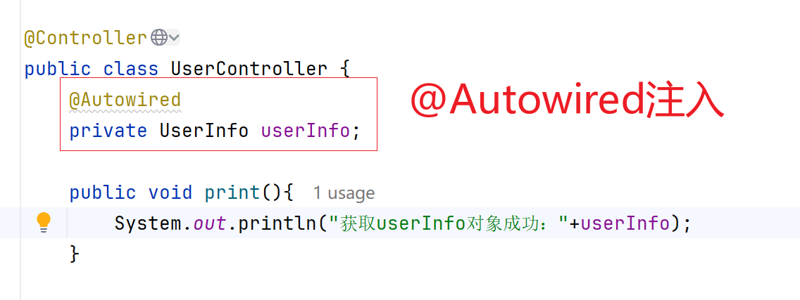 那个UserInfo对象我们已经交给Spring管理了,然后我们使用@Autowired注解,让Spring来给我们进行相应的类型注入