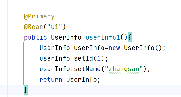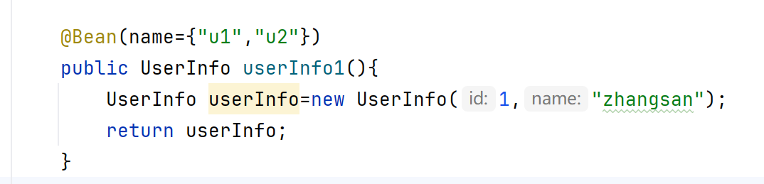 其中UserInfo是对象,我们通过@Bean注解,把它的这个返回值两个类型相同,但其内在的值不同UserInfo对象交给Spring容器管理,